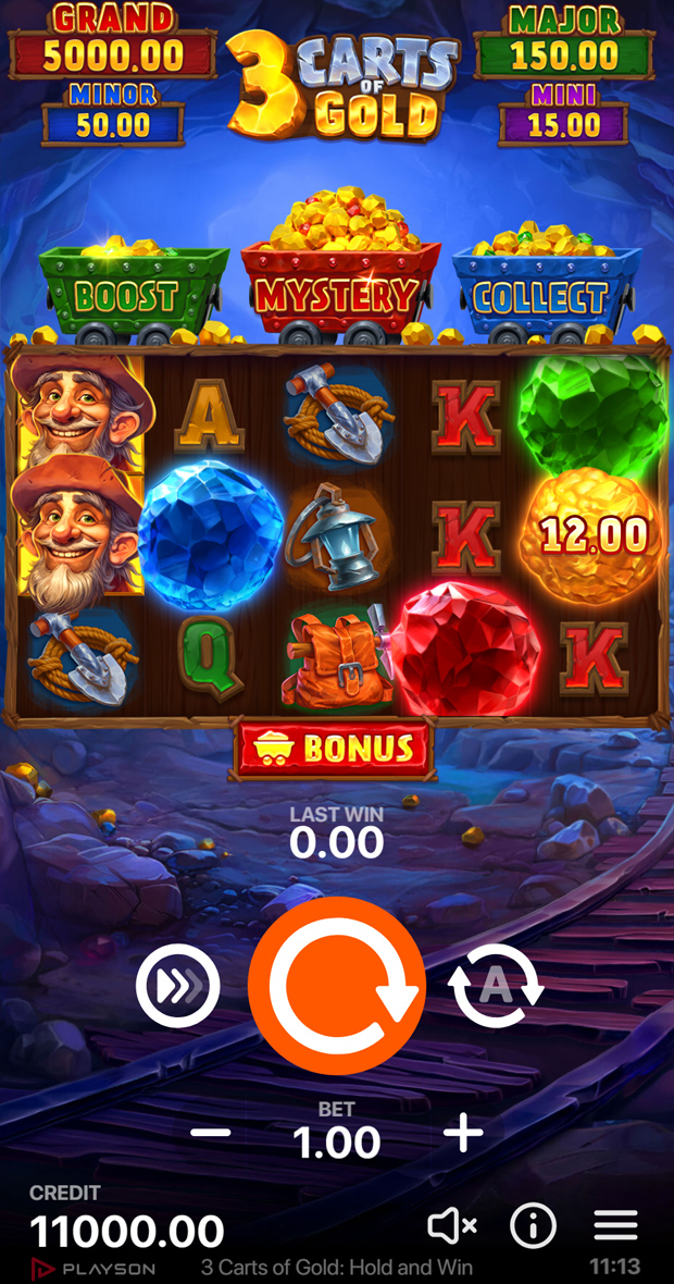 The journey to fortune intensifies with the Bonus Game, triggered by landing six or more Bonus symbols or its combination with colorful Gems. Each activated Bonus Game is uniquely thrilling, depending on the combination of Gems or Carts that initiate it. Each Cart offers a unique Bonus Game Feature – Boost Cart with its green Gems adds additional value to all other symbol values, Mystery Cart and red Gems rewards lucky players with generous wins, and Collect Cart with blue Gems collects all values from the reels.