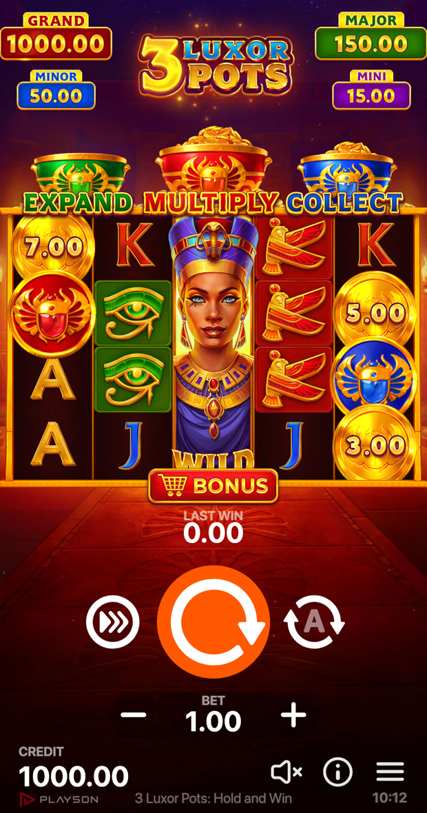 Uncover the mysteries of ancient Egypt in style, with 3 Luxor Pots: Hold and Win. This 5x4, 30 pay line offering welcomes back the trusty 3 Pots mechanic alongside coveted golden Bonus symbols and Scarab Coins which hold the key to the iconic Hold and Win bonus game.