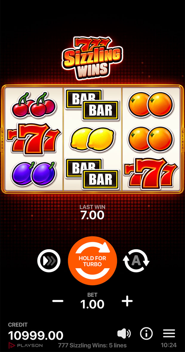 Welcome to "777 Sizzling Wins 5 Lines", an enticing new slot game brought to you by Playson. This captivating game captures the essence of vintage casino play with its classic fruits and sevens theme across a neat 3x3 field with 5 fixed pay lines.
