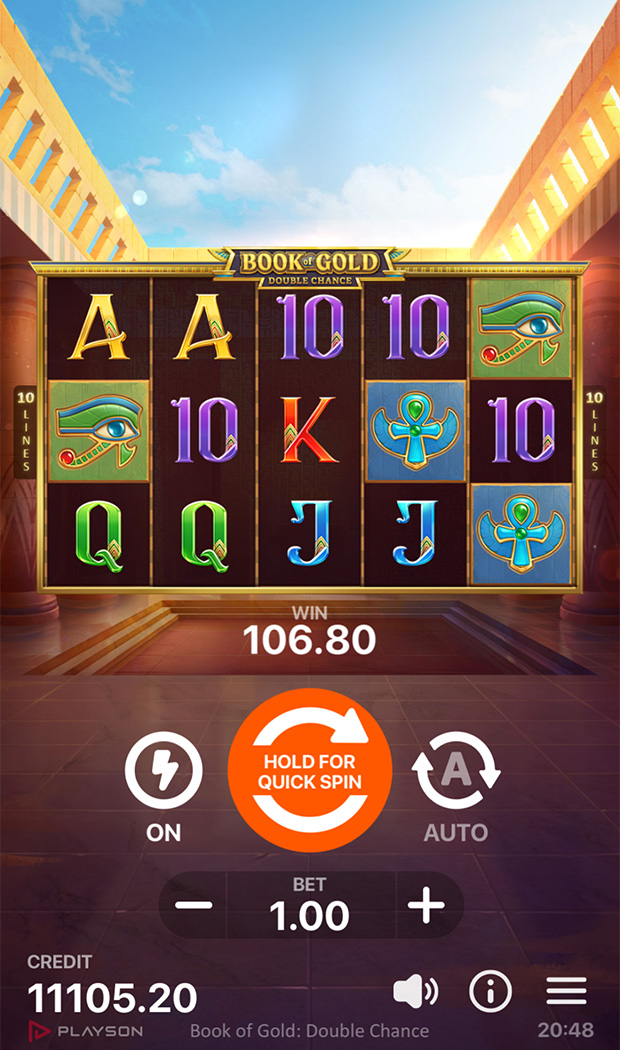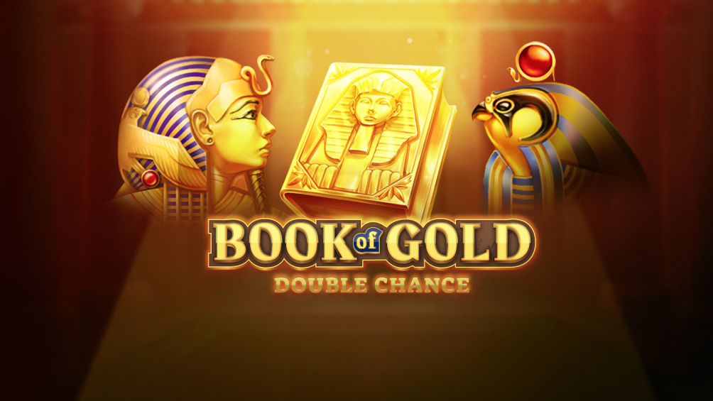 “Book of Gold: Double Chance” is an Egyptian-themed slot, set on a 3x5 grid with ten pay lines and featuring the sacred book as a Scattered-Wild.