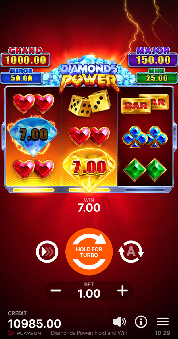 Diamonds Power, as the game series suggests, has a 3x3 layout with 5 active pay lines, the gameplay is also enhanced with exciting features such as the Diamonds Power Feature, Hold and Win Bonus Game and Diamond Pile feature. The latter lets players get the Hold and Win Bonus Game with every spin that contains any bonus symbols.