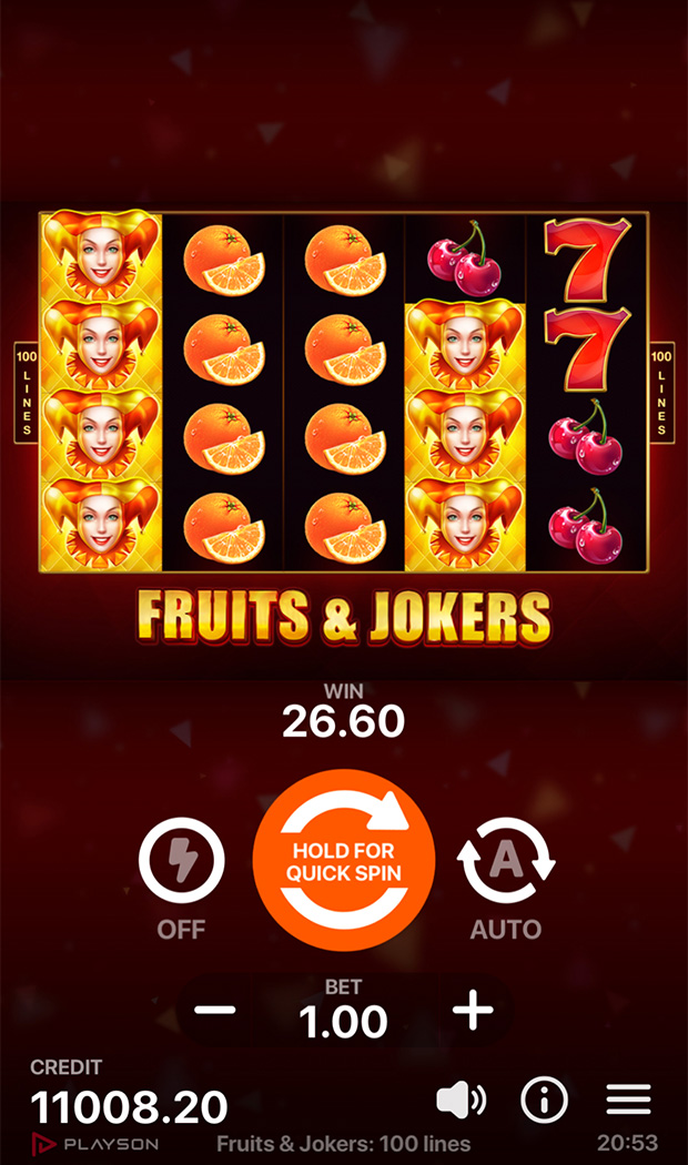 The 4x5 grid with stacked symbols of mellow fruits mixed with classic Red Seven symbols.