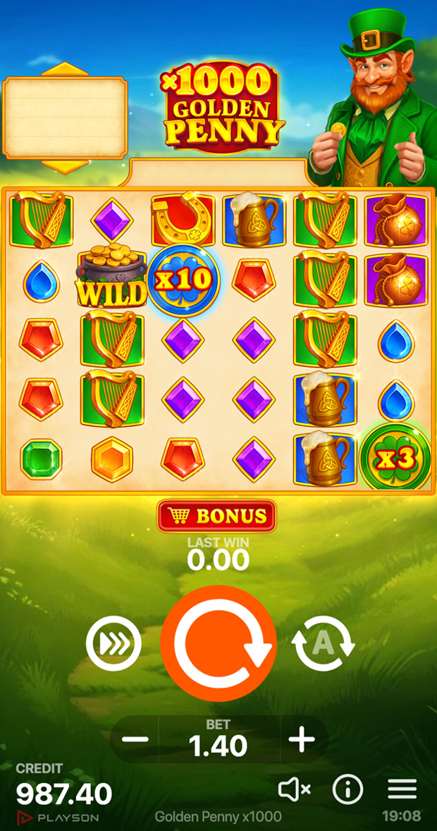 Get ready for a stroke of Irish luck in Golden Penny x1000. Our latest title is packed with iconic symbols of fortune, where a single spin can trigger cascading win chains. Our charming leprechaun is ready to grant an energetic round of Free Spins, featuring Multiplier symbols of up to x1,000. These can appear in the main game as instant boosts, while in Free Spins they accumulate into a growing Total Multiplier that enhances winnings with every spin.