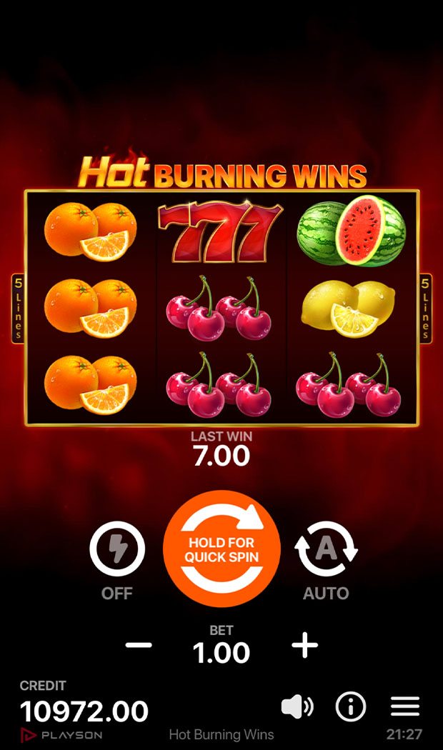 The 3x3 fruit slot with the modern look – “Hot Burning Wins,” offers simple rules and thus engaging for newcomers as well as for classic fruit lovers.