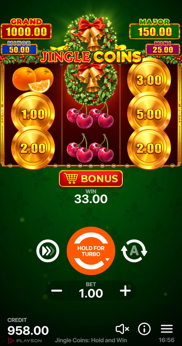 Feel the festive spirit with Jingle Coins: Hold and Win, a Christmas-themed 3x3 slot game filled with holiday cheer. Spin your way to big wins with four in-game jackpots and the exciting Jingle Coins Feature.
