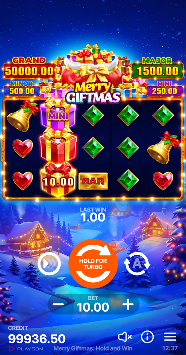 Feel the festive spirit with Merry Giftmas: Hold and Win, a Christmas-themed 5x3 slot game filled with holiday joy and big winning potential. Spin your way to festive rewards by activating the Bonus Game with six or more Bonus symbols, or by combining them with the Collect symbol.