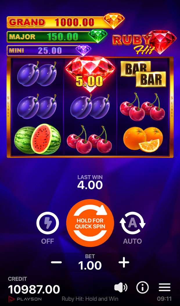 Classic 3x3 Ruby Hit slot combines well-known fruits with shiny and precious ruby gems.