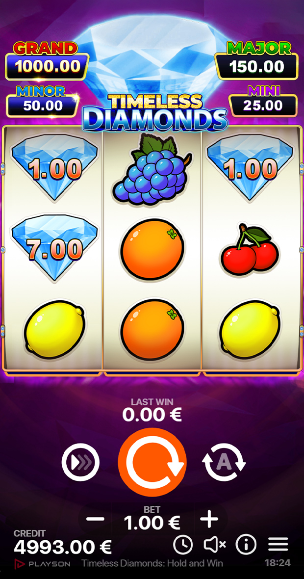 Classic slot simplicity shines in Timeless Diamonds: Hold and Win, a retro style 3x3 game where sparkling bonus jewels, multiplier boosts and four in-game jackpots elevate the classic Hold and Win mechanics. With a powerful Collect Feature and Extra Bonus, spins are as lavish as old-fashioned Vegas.