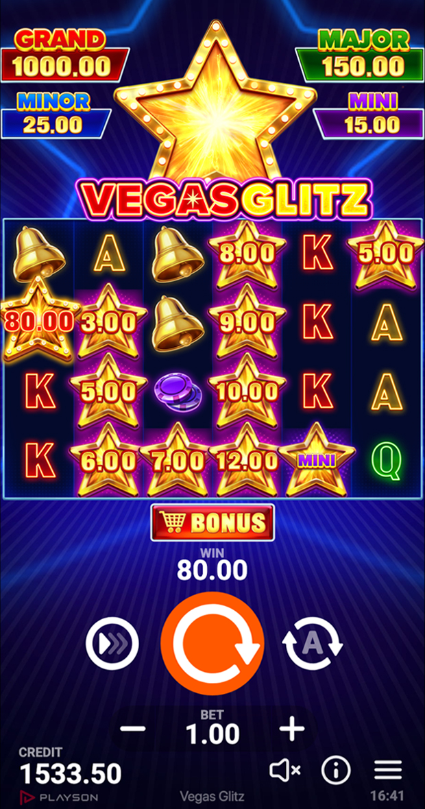Vegas Glitz invites players to the magical strip of Las Vegas, where class and high-stakes excitement collide. Set against a blue velvet backdrop with stunning lights, this dazzling 6x4 slot introduces an upgraded Bonus Feature, along with classic symbols, up to x1,000 in jackpots and generous Wild Multipliers.